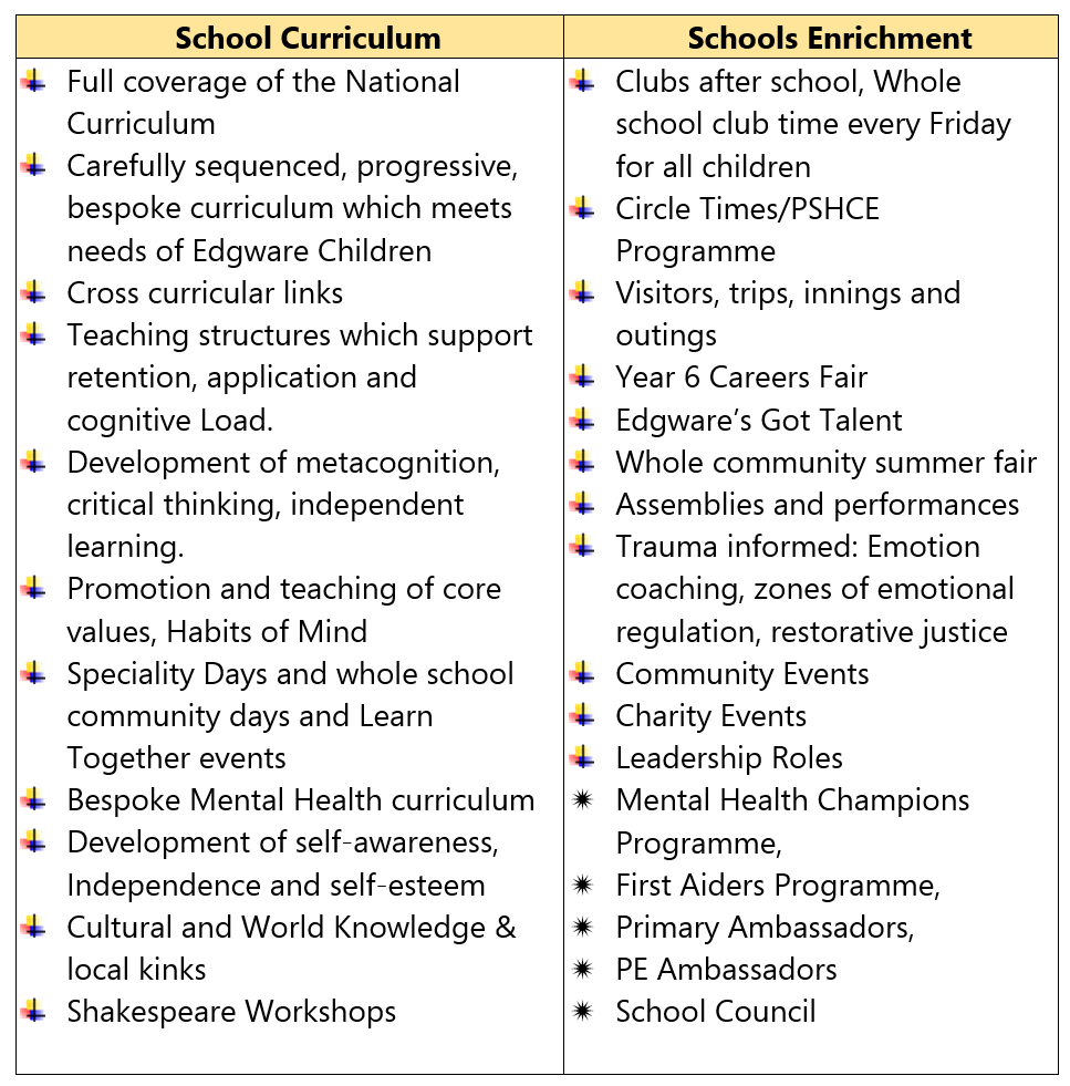 At Edgware Primary we believe in lifelong learning and the notion that learning should be enjoyable, within a nurturing and inclusive environment. We are accredited as a Thinking School - and thinking is at the very heart of our curriculum. We place emphasis on developing critical thinkers, independent and self-regulated learners. We want our pupils to have the confidence and skills to ask questions and find answers independently. Through our engaging, bespoke and balanced curriculum, we encourage reflective and creative thinking and inspire our children to bring their own experiences and ideas. We equip our pupils with the broad skills, rich knowledge and understanding necessary to develop as resilient, 'whole children'. We give all pupils, including children that are disadvantaged and with SEND, the knowledge and cultural capital they need to succeed. We ensure that we embrace the cultural diversity of our families and this is reflected in our curriculum. In the process of teaching diversity and promoting equality and inclusion, we help pupils to develop a multitude of valuable attitudes and transferable skills such as acceptance and tolerance.